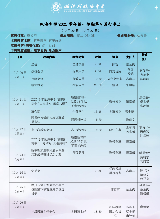 瓯海中学2025学年第一学期第九周(10.20-10.26)周行事历