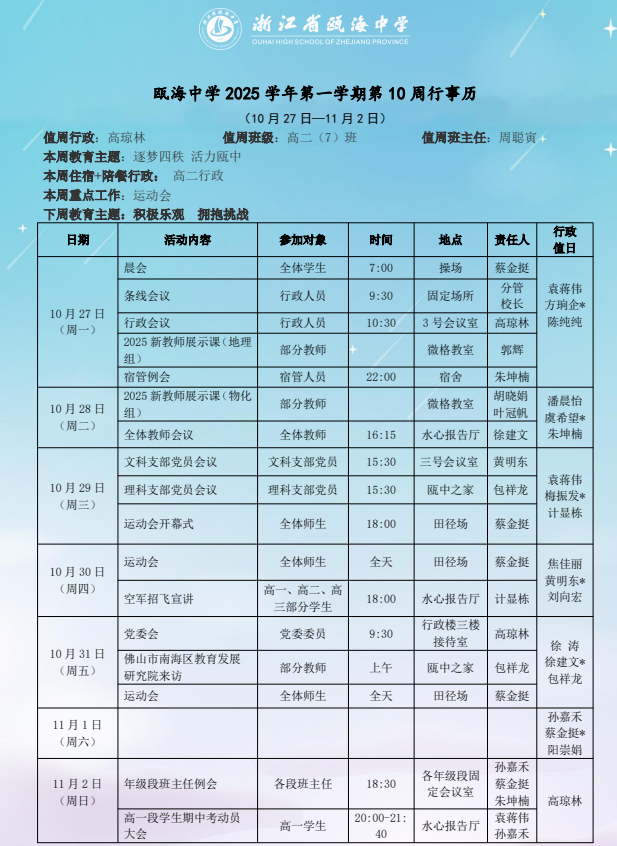 瓯海中学2025学年第一学期第十周(10.27-11.2)周行事历