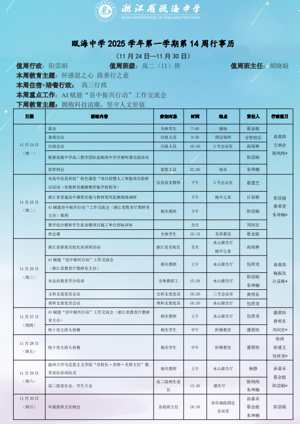 瓯海中学2025学年第一学期第十四周(11.24-11.30)周行事历
