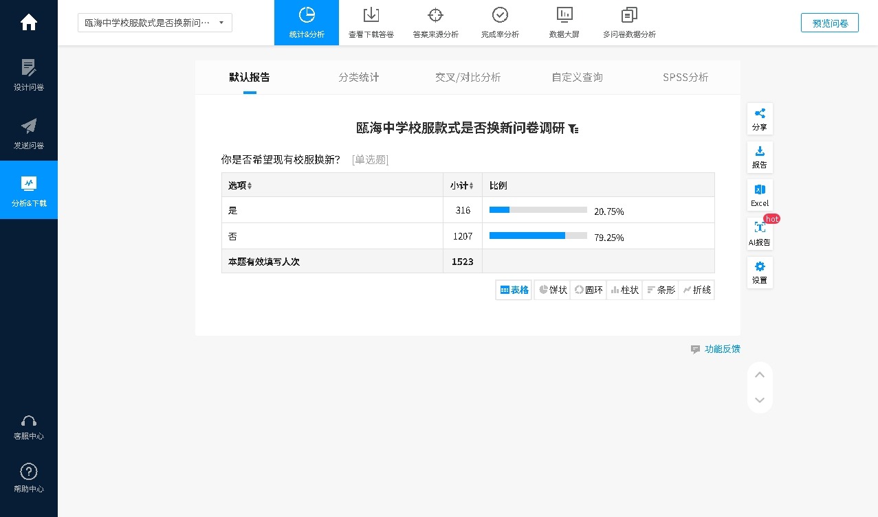 为了充分听取学生对于现校服款式为了充分听取学生对于现校服款式的满意程度,学校面向全校学生开展校服款式更换意见征询问卷,共计收回问卷1523份,其中希望校服换新学生316人,占比20.75%,不希望校服换新学生1207人,占比79.25%。现予以公示。
