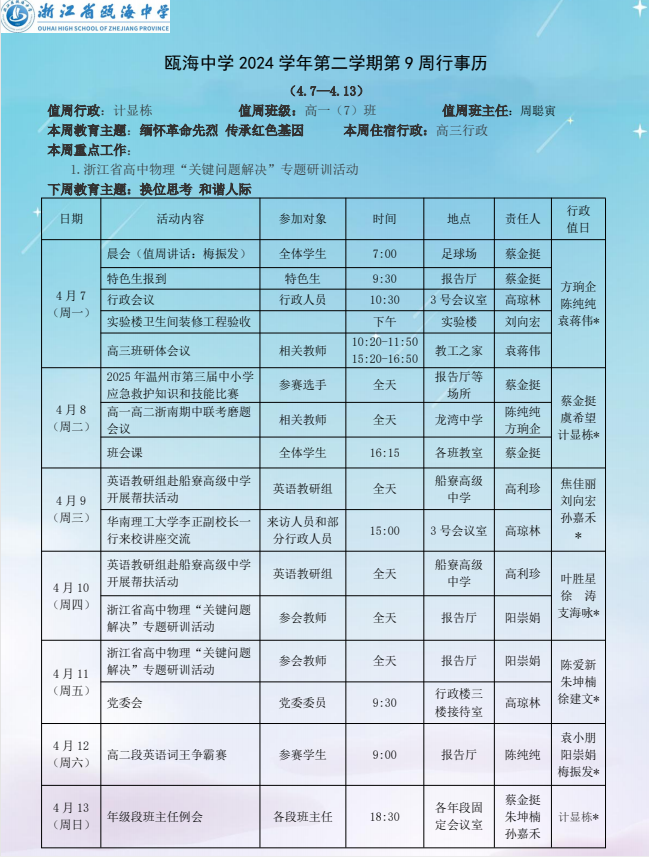 瓯海中学2024学年第二学期第九周(4.7-4.13)周行事历