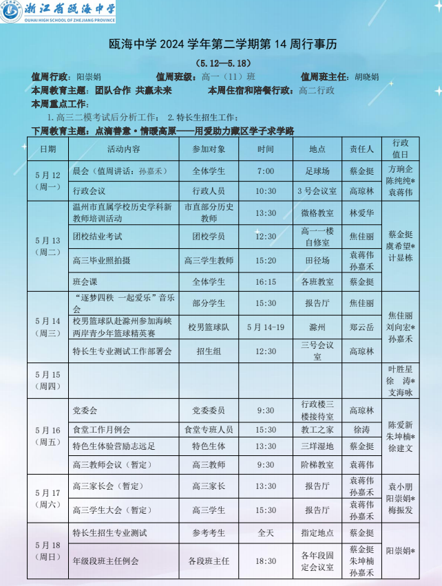 瓯海中学2024学年第二学期第十四周(5.12-5.18)周行事历