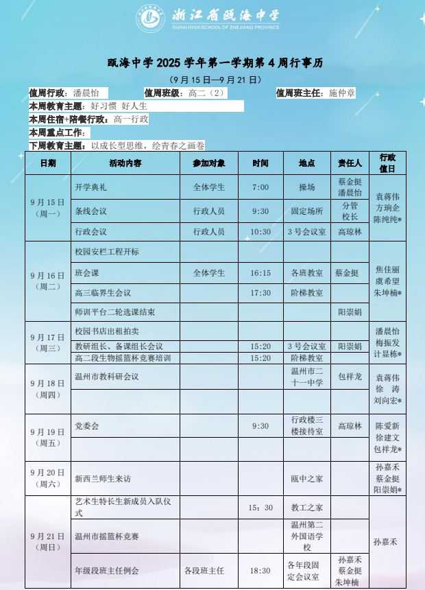 瓯海中学2025学年第一学期第四周(9.15-9.21)周行事历