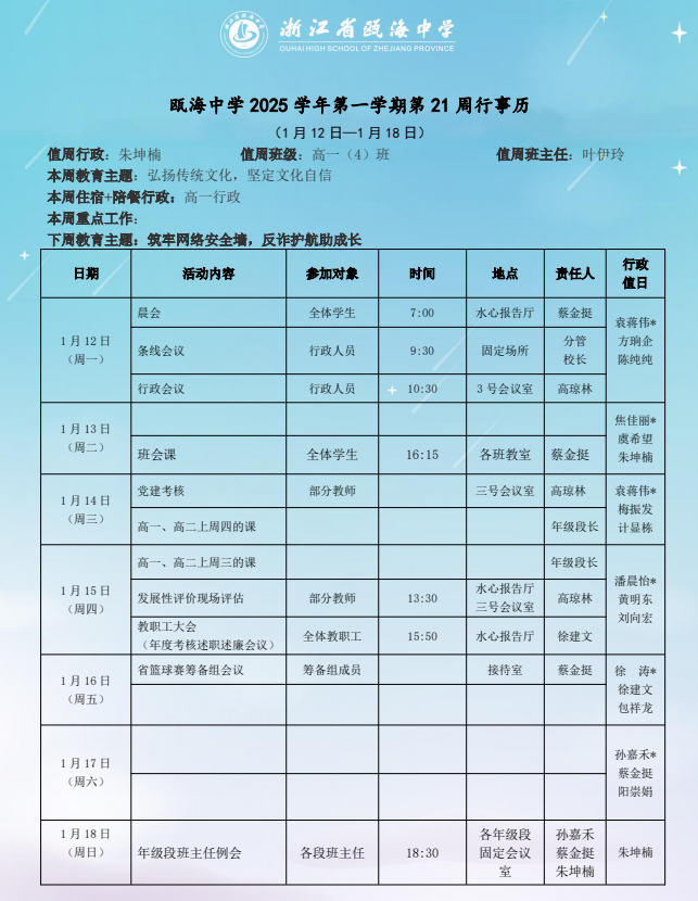 瓯海中学2025学年第一学期第二十一周(1.12-1.18)周行事历