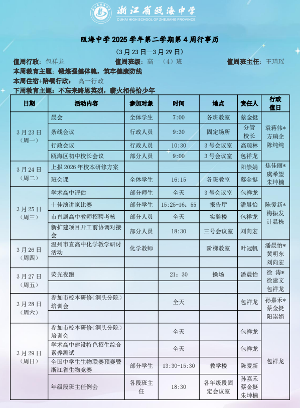 瓯海中学2025学年第二学期第四周(3.23-3.29)周行事历